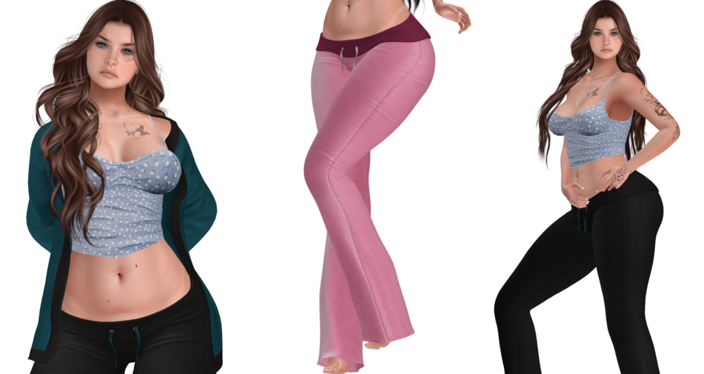 The jacket colors between 30 solid colors for the Main and trim. The shirt colors between 30 solid colors and 10 print patterns. The pants colors between 30 solid colors for the top band, main pants and the laces. There’s also a choice of 3 metal colors for the pants. This outfit is rigged to fit Legacy/Legacy Perky, Maitreya X, and Reborn